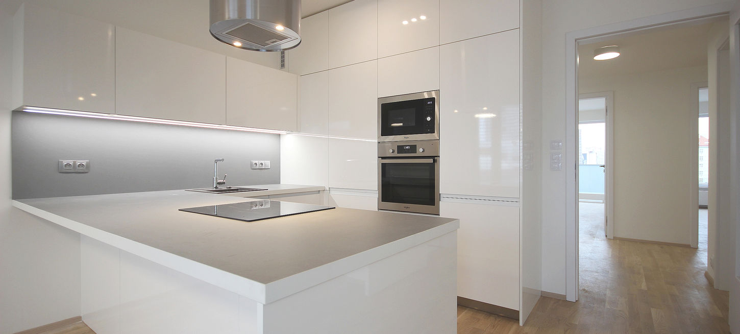 Designová kuchyňská linka od firmy Hanák na míru až do stropu, spotřebiče: lednice s mrazákem, myčka, horkovzdušná a mikrovlnná trouba, indukční varná deska, komínová digestoř.