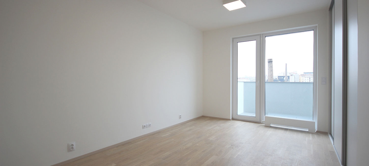 Prostorný obývací pokoj s kuchyňským koutem a balkonem orientovaným na východ do klidného vnitrobloku s privátní zahradou, určenou pouze pro rezidenty.