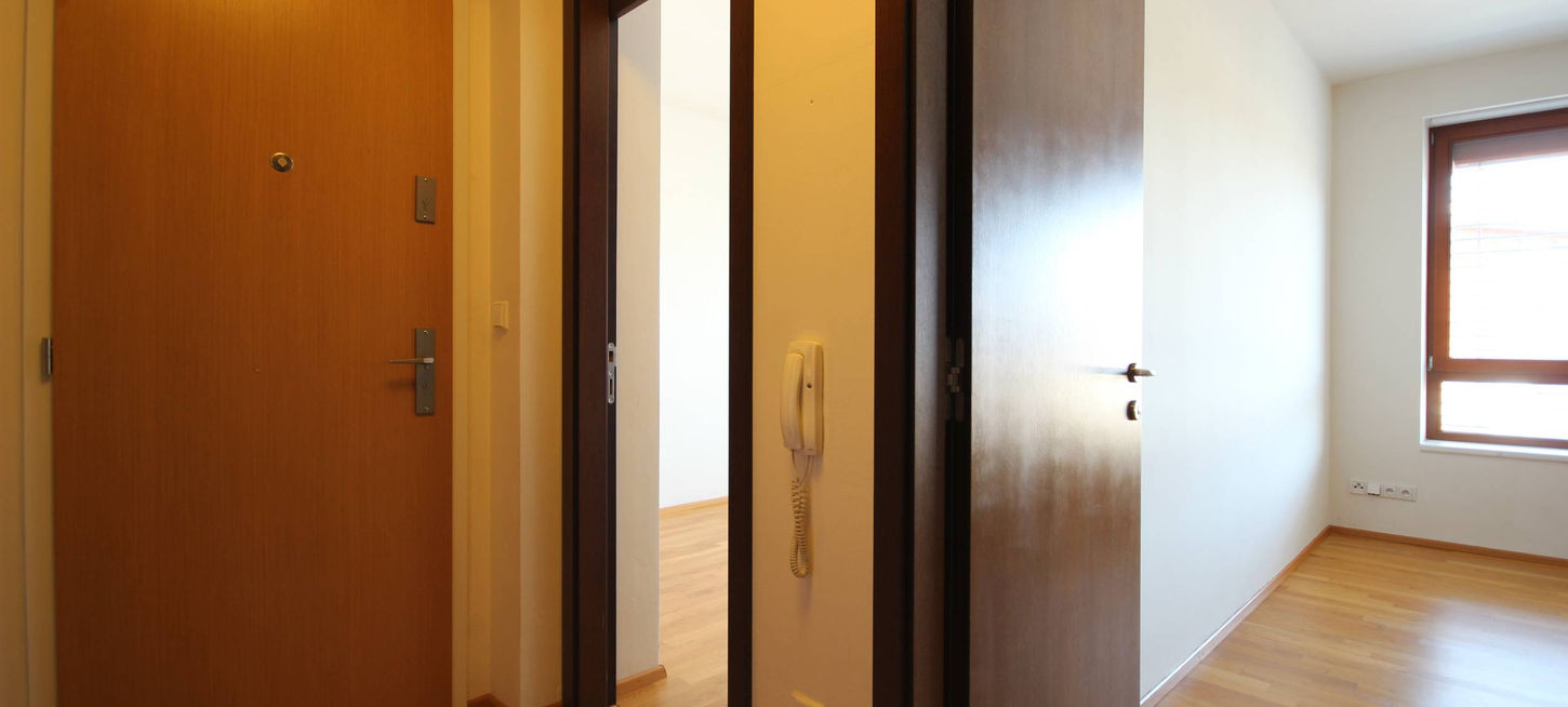 V předsíni je vestavěná skříň, v ložnicí je zároveň dostatečný prostor pro umístění vlastní skříně podle potřeby. Kuchyňská linka je dle návrhu designéra pro maximální efektivní využití prostoru, je vybavena varnou deskou, odsavačem par, horkovzdušnou troubou, mikrovlnnou troubou s grillem, myčkou nádobí a lednicí s mrazákem. Zároveň místnost s kuchyní lze zcela uzavřít posuvnými dveřmi od ostatních prostor. V koupelně je sprchový kout a přívod pro pračku.